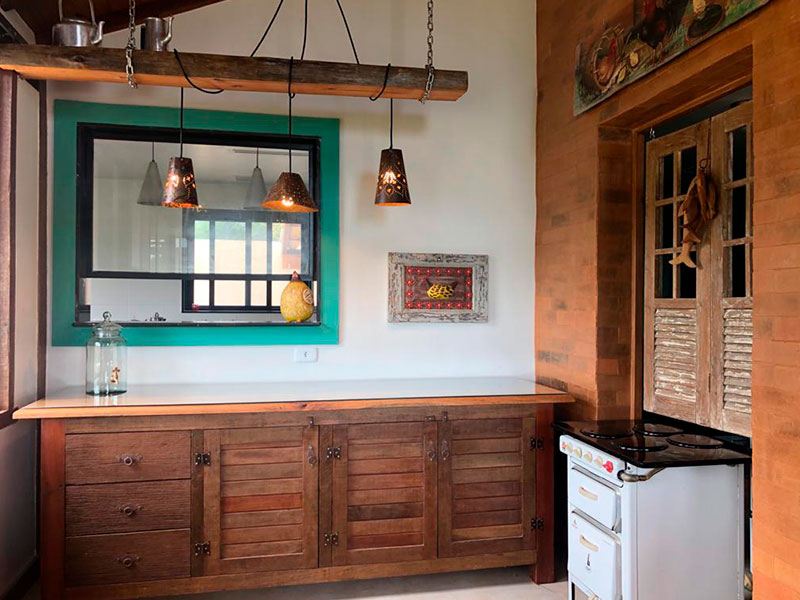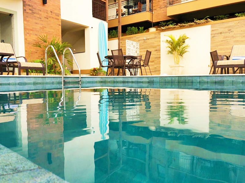 A área da piscina também conta com uma ducha e um bar. O funcionamento do bar é baseado na relação de confiança entre o hóspede e os donos da pousada – o hóspede pega a bebida na geladeira e anota no caderninho do bar. Se desejar petiscos ou drinques do Bistrô, há um interfone para solicitar o serviço.